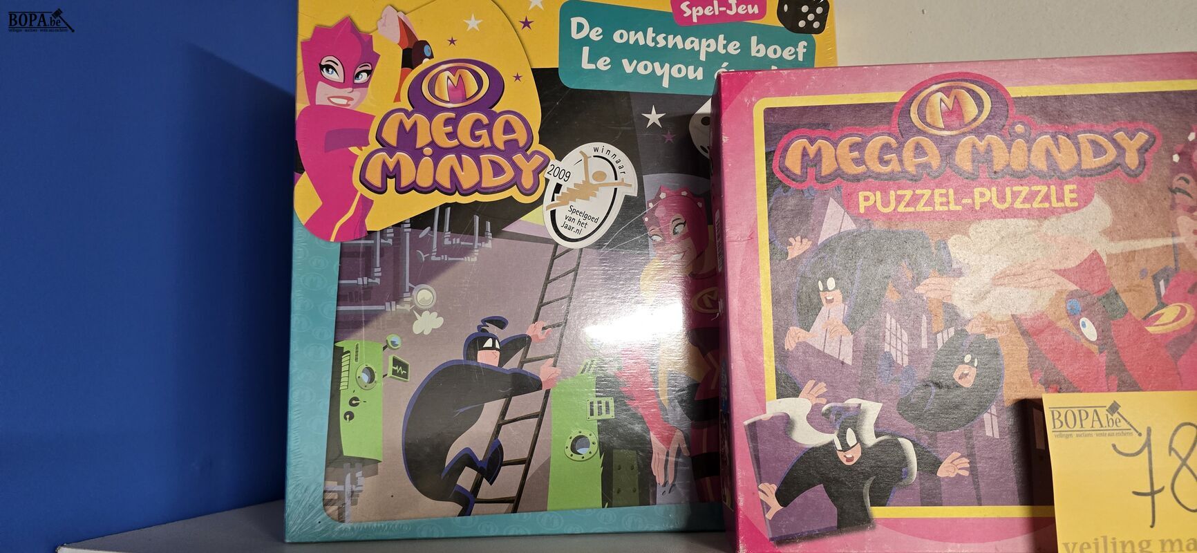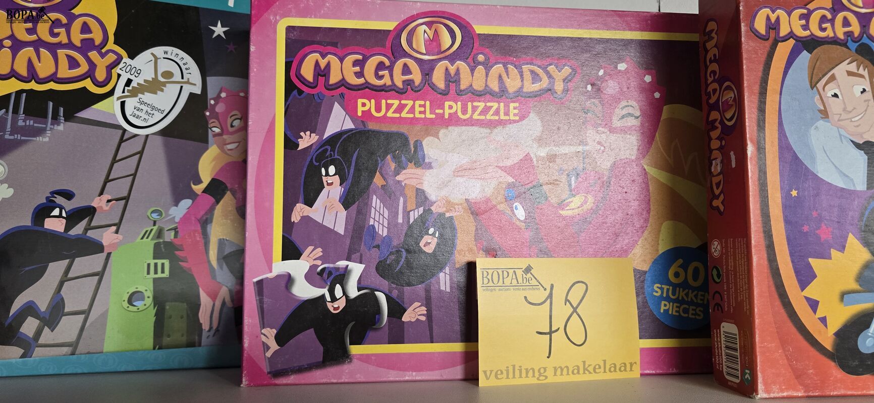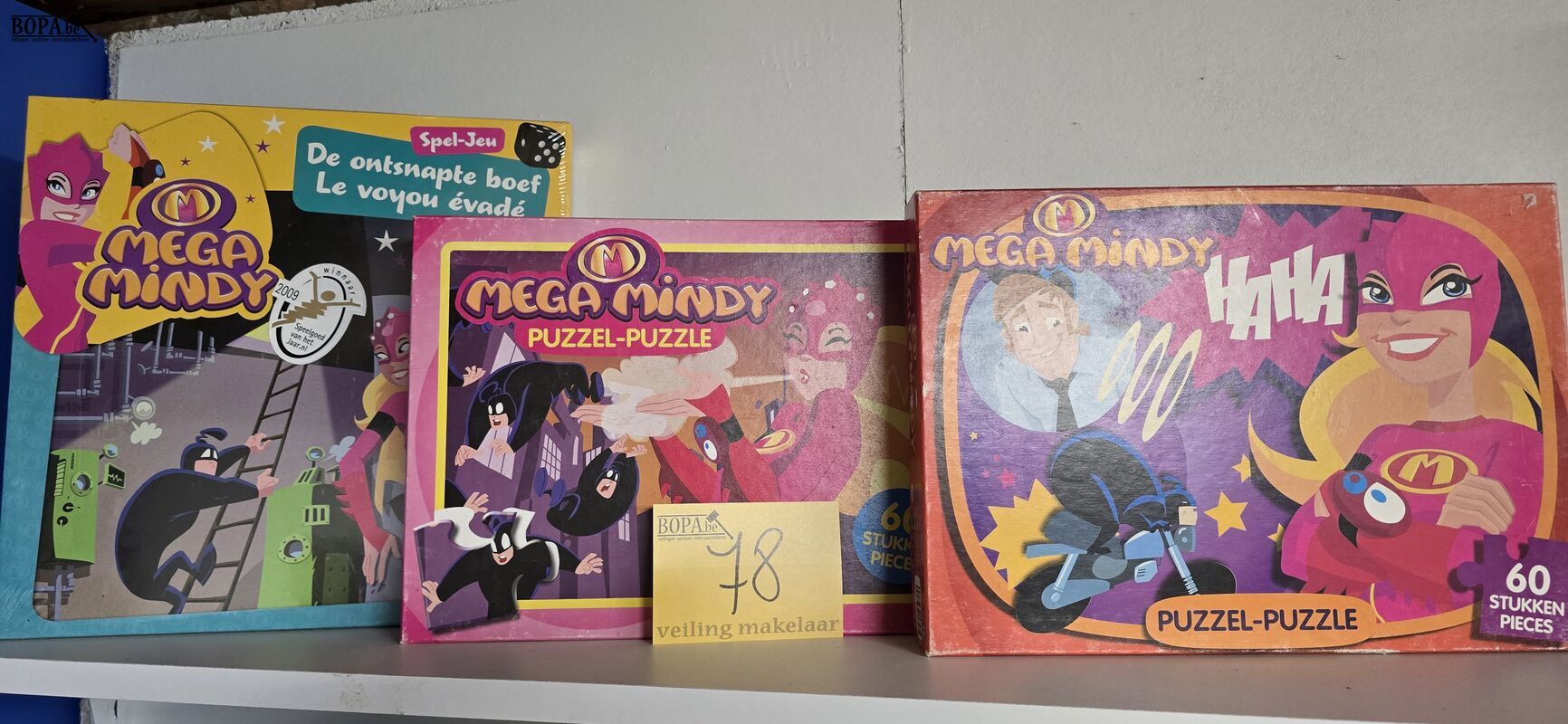 Mega Mindy speelset, gezelschapspel ' De ontsnapte boef' nieuw en 2 puzzels van 60 stukken